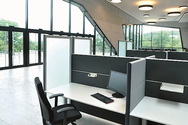 Mit den Arbeitsplatz – Schutzblenden der Firma AOS können einzelne Arbeitsplätze aber auch ganze Raumzonen sicher und mit hoher gestalterischer Qualität abgeschirmt werden. Die aus 6 mm ESG (Einscheiben Sicherheitsglas) gefertigten Schutzblenden sind hochwertig verarbeitet und ausgestattet mit einem feinen Kantenschliff sowie gerundeten Sicherheitsecken.